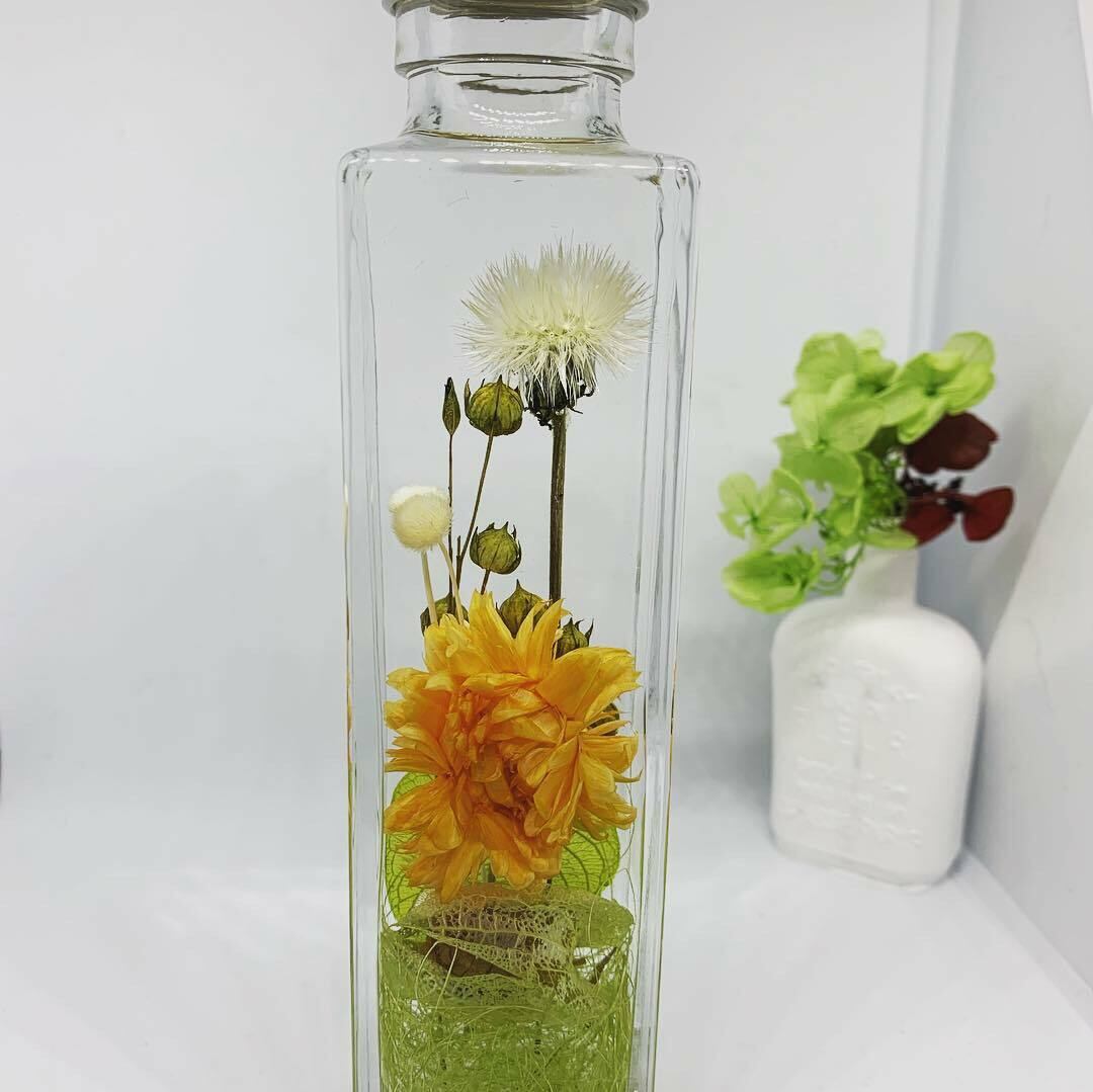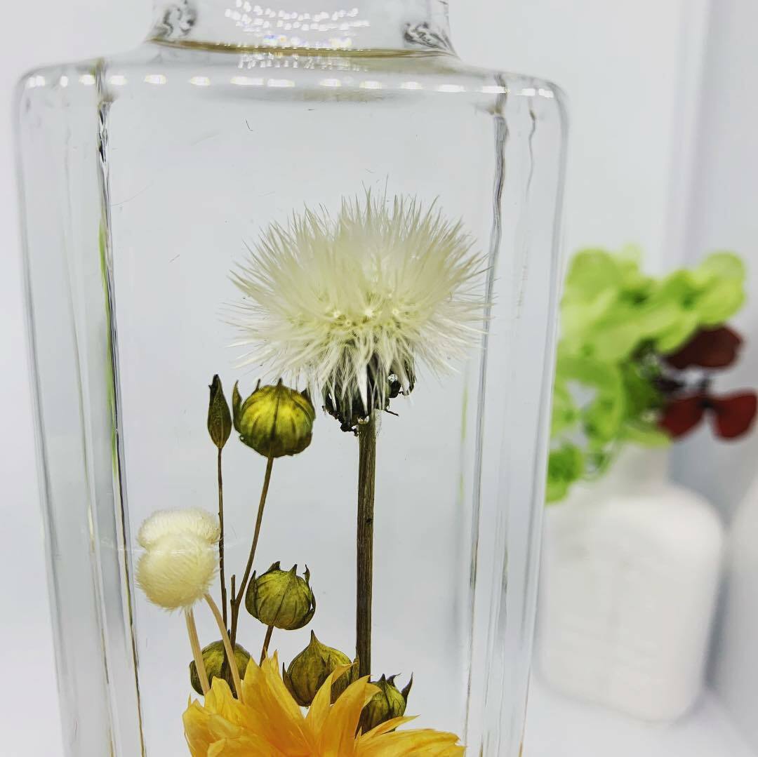 きっと皆さんも子供の頃、タンポポの綿毛にふーっと息を吹きかけて遊んだ記憶があると思います。本当に一瞬で吹き飛んでしまいますよね。そんな一瞬の夢をハーバリウムに」閉じ込めてみました。